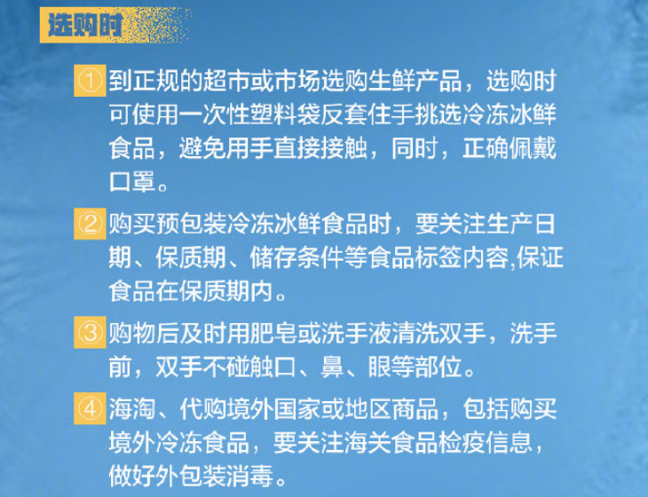 到正規(guī)的超市或市場選購生鮮產(chǎn)品,選購時可使用一次性塑料袋反套住手挑選冷凍冰鮮食品,避免用手直接接觸,同時,正確佩戴口罩。