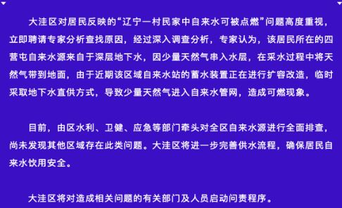 那么這家自來水為什么能被點燃呢?盤錦市大洼區(qū)委宣傳部,通報了調(diào)查結(jié)果