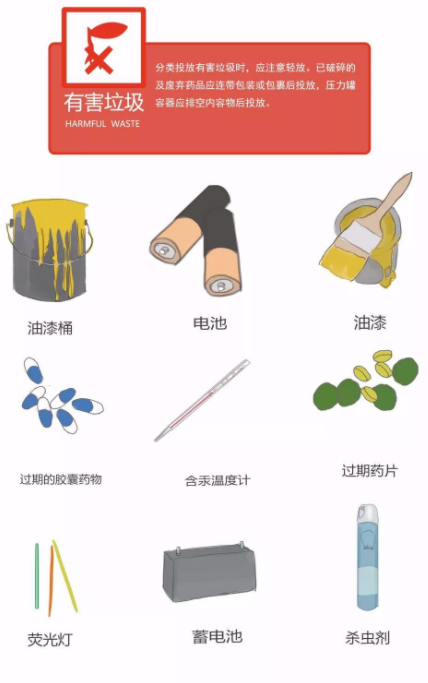 常見(jiàn)包括廢電池、廢熒光燈管、廢燈泡、廢水銀溫度計(jì)、廢油漆桶、過(guò)期藥品、過(guò)期化妝品等。有害有毒垃圾需特殊正確的方法安全處理。