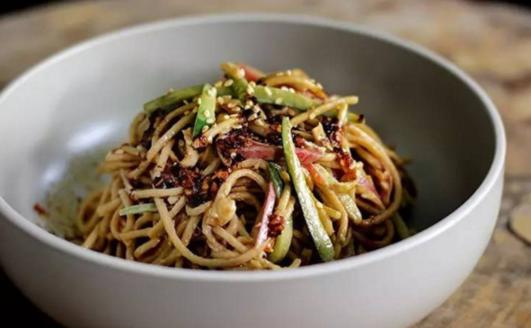 食材明細(xì):面條、芝麻醬、綠豆芽、黃瓜、胡蘿卜、雞蛋、蒜、香蔥、油炸花生米、鹽、雞汁、白糖、香醋。