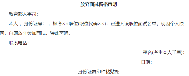 放棄面試要填寫《放棄公務(wù)員面試的聲明》,經(jīng)本人署名,在規(guī)定時間前提交;格式如下: